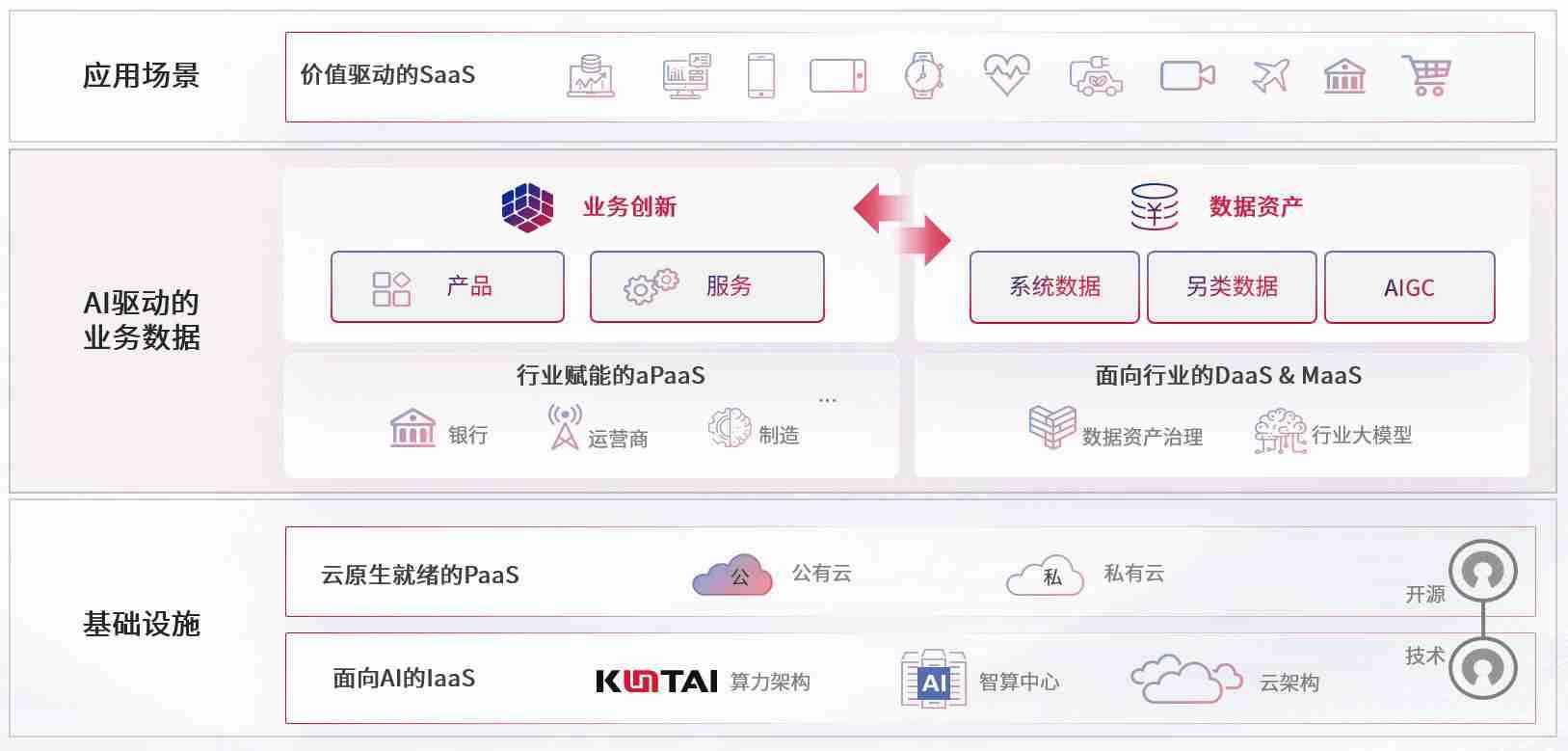 数字时代,,,,围绕企业数字化转型的关键要素,,,,狗子28数码开创性的提出数云融合战略和技术体系框架,,,,着力在云原生、、数字原生、、、AI原生和信创产业上架构产品和服务能力,,,为处在不同数字化转型阶段的快消零售、、、、汽车、、、金融、、、医疗、、、政企、、、、教育、、运营商等行业客户提供泛在的敏捷IT能力和融合的数据驱动能力,,,构建跨界融合创新的数字业务场景和新业务模式,,,,助力企业级客户建立面向未来的核心能力和竞争优势,,,全面推动社会的数字化、、智能化转型升级。。